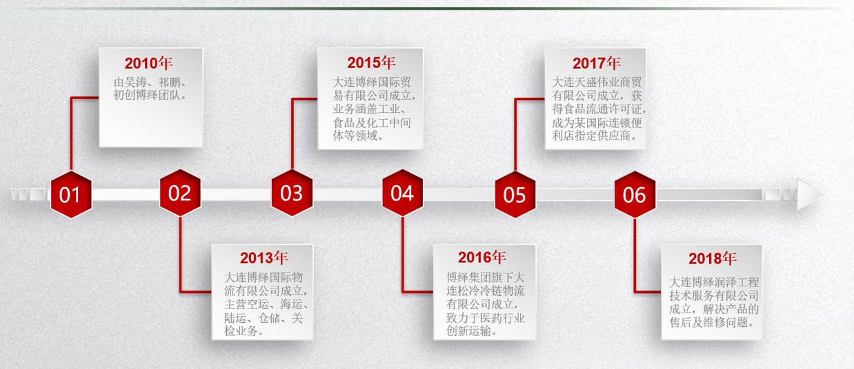 為更好地向客戶提供全球貨物流通服務(wù),集團先后成立了大連博繹國際貿(mào)易有限公司、大連松冷冷鏈物流有限公司、大連天盛偉業(yè)商貿(mào)有限公司及大連博繹潤澤工程技術(shù)服務(wù)有限公司。在未來的發(fā)展中,集團將繼續(xù)為客戶提供專業(yè)服務(wù),為員工實現(xiàn)自我價值,為社會和諧發(fā)展和文明進(jìn)步做貢獻(xiàn)。